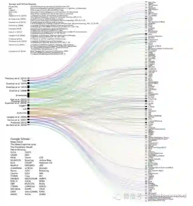 图 1. 来自调查、在线编目和谷歌学术的认知架构的组合列表。左侧的节点表示架构的调查和在线编目,右侧的节点表示单独的项目。节点的厚度表示连接到该节点的边(edge)的数量,即该架构出现的次数(右侧)或所包含的架构的数量(左侧)。