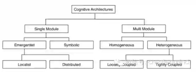 由于没有任何一个范式(paradigm)可以单独处理全部的人工智能问题,混合架构试图结合符号式和层创式两种元素。总的来说,两者如何混合没有一个明确的限制,但有的方法更加直观且易于执行。例如,CLARION 基于不同知识类型有不同的表现形式:明确的事实知识用符号式,程序中暗含的知识用亚符号式 [40]。4CAPS 将传统的符号式生产系统用联结主义的计算机制:如阈值、激活、权重和并行处理来诠释 [41]。这种混合方式被 Duch 等人 [21] 称作符号式联结主义(symbolicconnectionist)。同时他们也定义了一种替代的地区性分布方法。后者很好的例子就是 Leabra,它在学习不变事物的检测时用到了标签的地方主义(localist)表征和特征的分布式表征 [42]。在 [43] 中,这两种混合式的表征被分别称作平行和垂直的整合。一个混合联结主义-符号化模型的更为细致的分类方法在 [44] 中呈现。