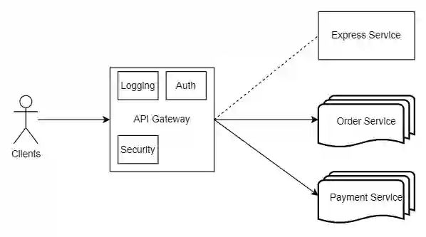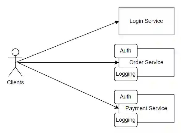 可以看到,在 Order 和 Payment 服务中,身份认证和日志记录功能是重复的。一个电商的服务,一般会有数千个不同的服务组成,这时候就会有大量的代码和功能是重复开发的。