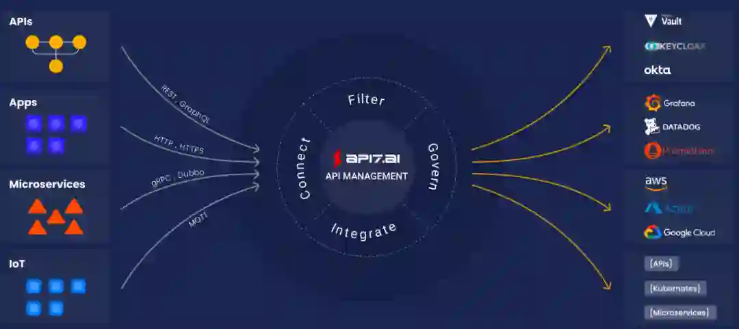 API 网关无法独立解决安全性、可观察性、灰度发布等问题。它需要与 Prometheus、Zipkin、Skywalking、Datadog、Okta 等众多开源项目和 SaaS 服务合作,为企业提供更好的解决方案。