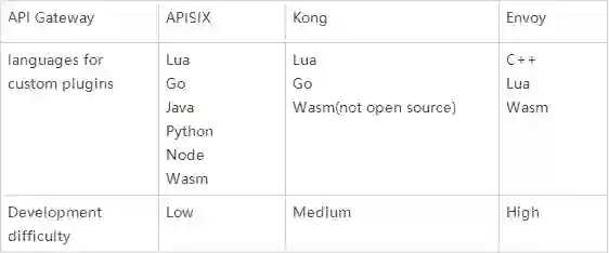 同时,让开发者能够以更低的成本进行二次开发,也成为了下一代 API 网关的亮点。集成是 API 网关的重要功能之一,对于下游是协议解析和各种协议的转换,包括 GraphQL、gRPC、Dubbo 等;对于上游是集成 Okta、Keycloak、Datadog、Prometheus 等身份认证、可观测性服务,以及公司内部的认证、日志、审计等服务。API 网关不可能覆盖集成过程中所有的组件,这时候不可避免地需要开发者通过插件的方式进行二次开发,来满足自己的业务需求。不同的 API 网关提供了不同的二次开发的编程语言和开发方式,Apache APISIX 和 Kong 都可以使用 Lua 来编写原生插件,Envoy 是使用 C++ 编写原生插件。同时,Apache APISIX 还可以使用 Go、Python、Node、Java 和 Wasm 来编写插件,这些主流的开发语言已经可以覆盖绝大部分开发者了。