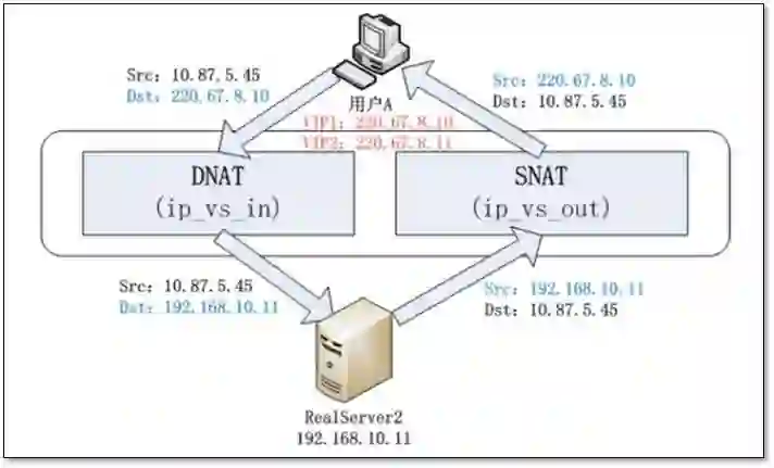 为了解决上述问题,开发出FULLNAT,该模式和NAT模式的区别是:数据包进入时,除了做DNAT,还做SNAT(用户ip->内网ip),从而实现LVS-RealServer间可以跨vlan通讯,RealServer只需要连接到内网。类比地铁站多个闸机。