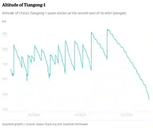 天宫一号的轨道高度变化图,可以看到轨道高度一旦缺乏控制就会在空气作用下逐渐降低。自2016年起我国中止数据连接后,天宫一号进入最终返回地球阶段,预计将在2018年2月份前后返回地球 。(图片来自Space-track.org)