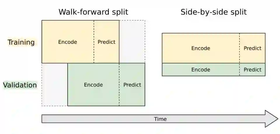Walk-forward 分割。这实际上不是分割:我们在完整数据集上训练和验证,但使用不同的时间跨度。验证用的时间跨度比训练用时间跨度前移一个预测间隔。