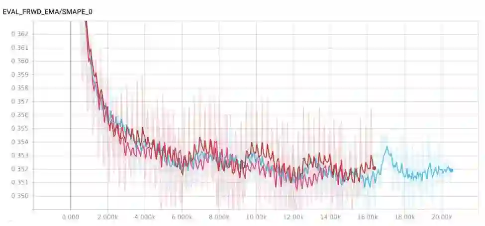 三个模型的结合表现不错(在每个检查点上使用平均模型权重的 30 个检查点的平均预测)。我在排行榜上(针对未来数据)获得了相较于历史数据上的验证大致相同的 SMAPE 误差。