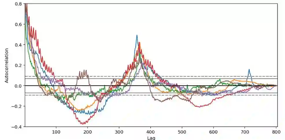 全局特征。如果我们查看自相关(autocorrelation)函数图,就会注意到年与年之间强大的自相关和季节间的自相关。
