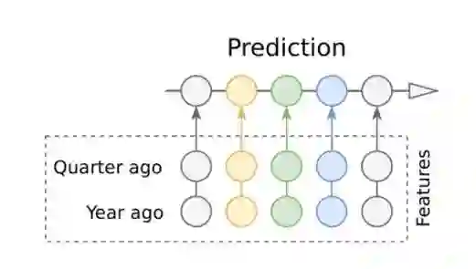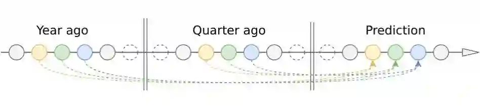 我们可以采用 current_day - 365 和 current_day - 90 这两个时间点的编码器输出,并将它们馈送到全连接层以降低维度,并将结果加入到解码器的输入特征中。这个解决方案虽然简单却大大降低了预测误差。