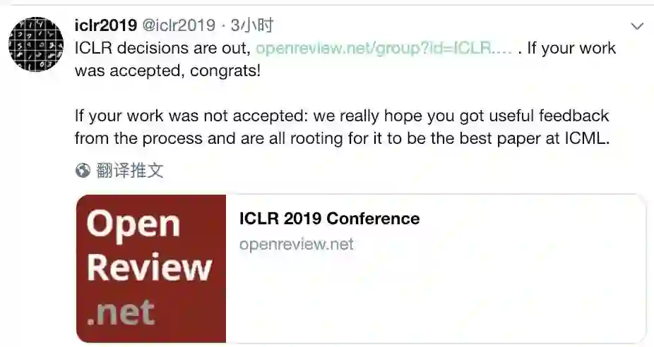 不久之前,ICLR 2019 的论文评审结果出炉,评审们已经在论文的 openreview 页面公布了他们的评论和分数。今日,ICLR 2019 官方 Twitter 宣布接受论文结果公布。如果你的论文上榜了,祝贺!