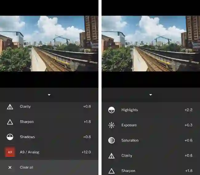 色温色调可以调的偏冷和偏蓝一些,假如要拍摄晚霞,调整的话就是偏暖偏黄,这些都是根据拍摄的题材与环境决定,其核心思路都是让天空的颜色更加浓艳一点。这里推荐使用 VSCO A9 滤镜,它比 A8 滤镜要温暖一些,套用之后不会有太明显的滤镜感。