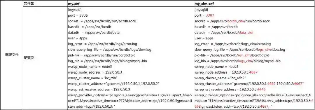 保留OP实例原my.cnf配置文件,为CLM实例创建新的配置文件my_clm.cnf,在配置文件中对mysql内外端口、数据目录、日志目录、pid、socket文件路径等参数进行重新配置,如下表所示: