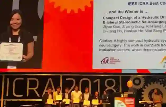 在 18 年 ICRA 大会上,共计 11 大奖项共 40 篇提名论文。国内高校团队获得提名的有香港大学的 Ziyan Guo 团队和台湾成功大学的 Chao-Chun Chen 团队。最终,来自香港大学及威尔斯亲王医院的 Ziyan Guo 团队凭借《Compact Design of a Hydraulic Driving Robot for Intraoperative MRI-Guided Bilateral Stereotactic Neurosurgery》合作论文获得了 ICRA 最佳会议论文。这篇论文设计了一种高性能液压机器人平台,该机器通过磁共振成像(MRI)引导双侧立体定向程序,能够在标准头部成像的有限空间内进行操作。