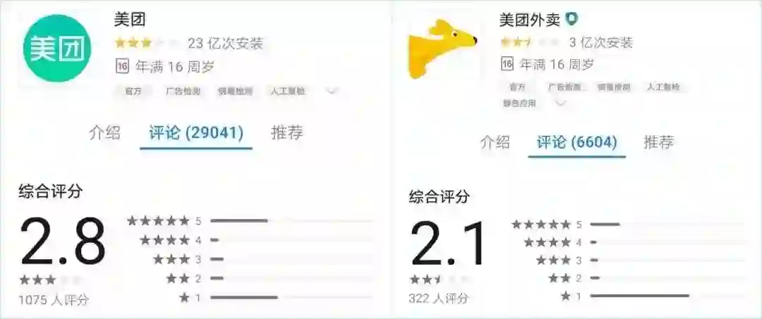 现在,在华为手机应用市场上,美团APP的评分低至2.8分,而美团外卖的评分更是低至2.1分(满分为5分)。