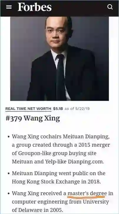 王兴就和导师说,博士不念了,要回去创业,于是拍屁股就走人了。后来,福布斯网站上的王兴资料,写的是特拉华大学硕士学位。