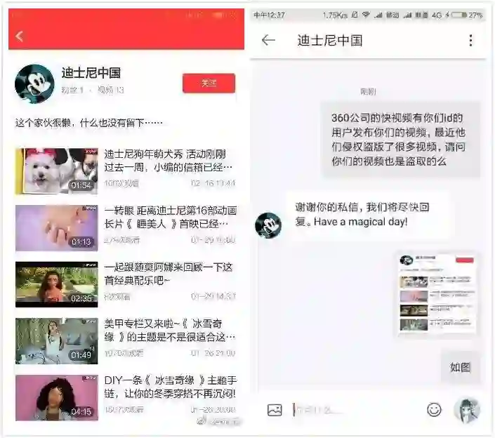 他们去私信同受牵连的维权狂魔迪士尼,告诉它快视频上有侵权视频: