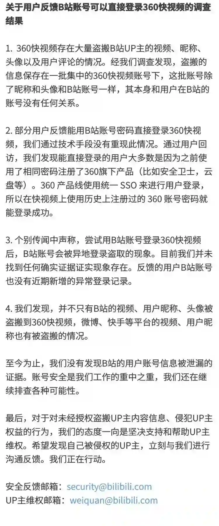 划重点:称通过用户回访发现,那些能直接用 B 站账号登录快视频的,大多是因为之前用相同密码注册了 360 旗下产品,而且并没有发现 B 站用户账号信息被泄露的证据。