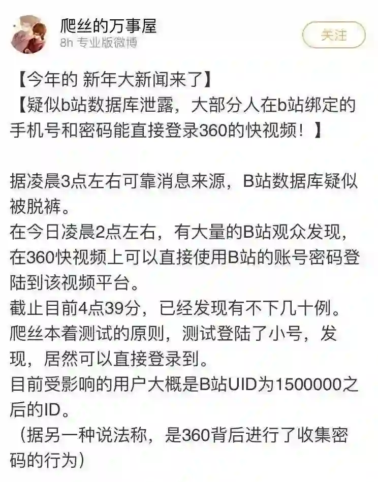 网友@爬丝的万事屋 在 04:44 发布微博称,B 站数据库疑似被拖库,大量 B 站用户可以直接使用 B 站账号登录 360 的快视频。