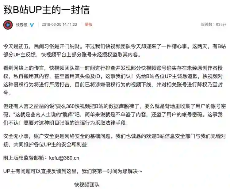 1 小时后,快视频又发布《致 B 站 UP 主的一封信》。