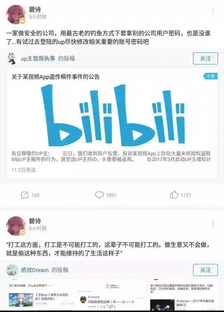 这次事件的影响范围非常广泛,它并不是只针对某些经常上传视频的大号。在 B 站上,一些只有很少粉丝量的个人账号内容也惨遭盗用,就连从未上传过视频的账号也被注册到了快视频平台。