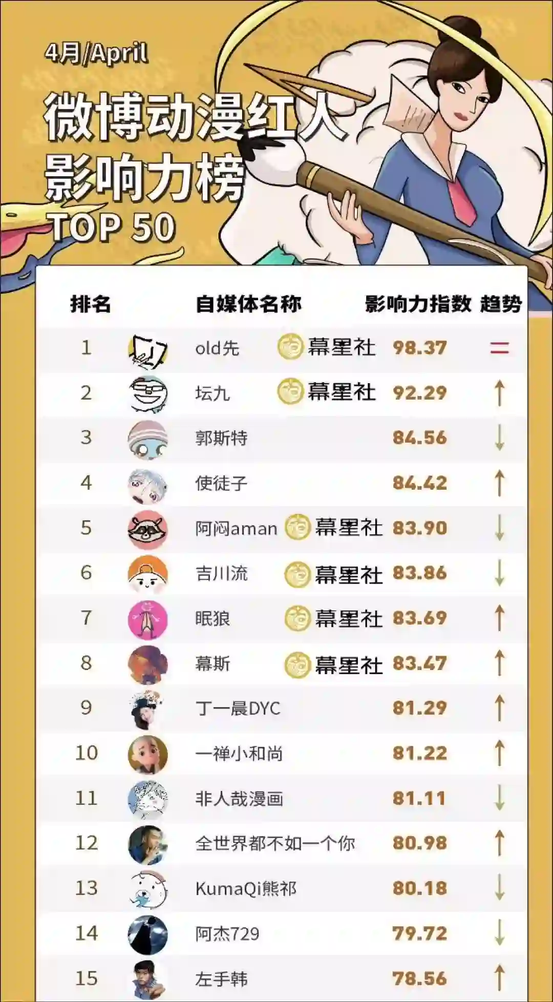 新浪微博发布4月动漫红人影响力榜单TOP50,幕星社old先和坛九稳居第一、二位,榜单前十名中有六位幕星社漫画家;