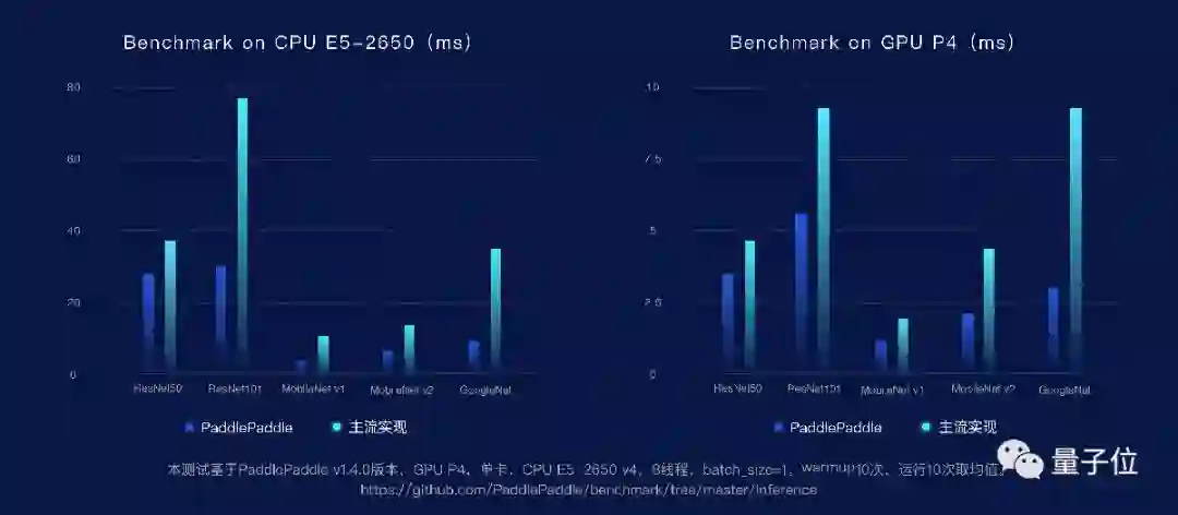 在Benchmark上可以看出,在英特尔的至强处理器上、P4 GPU上,飞桨的推理引擎都做了很好的优化。