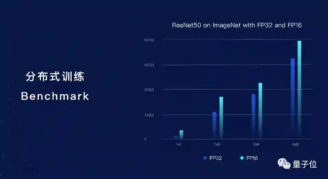 分布式训练效果怎么样?下图就是ResNet-50两种精度下在ImageNet上的训练benchmark,随着卡和机器数量的增加能实现很好的线性增长: