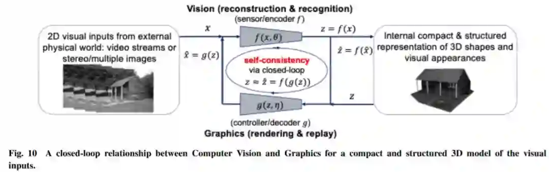 感知为压缩闭环转录?更准确地说,世界上物体的形状、外观甚至动力学的 3D 表征应该是我们大脑内部开发的最紧凑和结构化的表示,以一致地解释所有感知到的视觉观察。如果是这样,那么这两个原则就表明,一个紧凑和结构化的 3D 表征就是我们要寻找的内部模型。这意味着我们可以并且应该在一个闭环计算框架内统一计算机视觉和计算机图形,如图 10 所示。