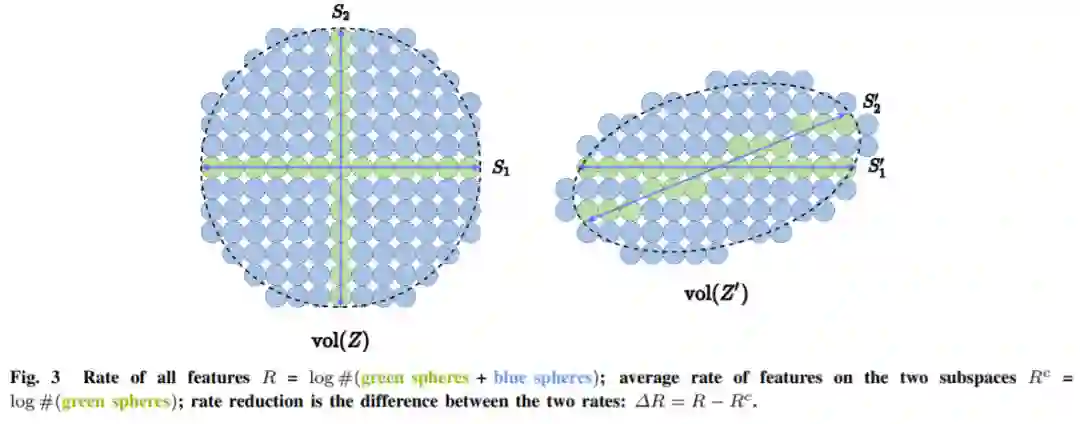 对于 LDR 模型系列,有一种自然的内在简约度量。直观地说,给定一个 LDR,我们可以计算所有子空间上的所有特征所跨越的总体积以及每个类别的特征所跨越的体积之和。然后这两个体积之间的比率给出了一个自然的衡量标准,来表明 LDR 模型性能:比率越大越好。图 3 展示了一个示例,其中特征分布在两个子空间 S1 和 S2 上。
