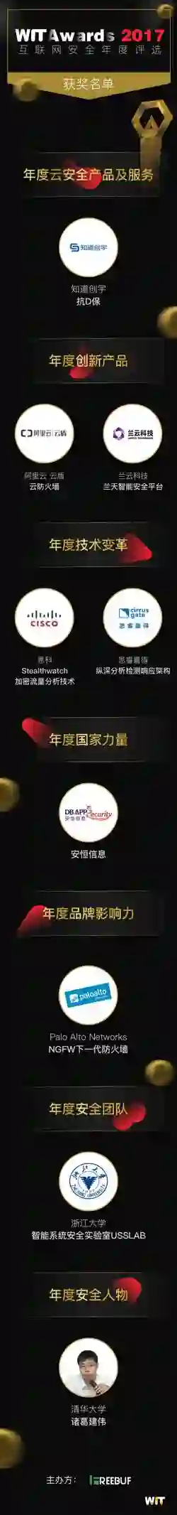 本次WitAwards 2017评选全程历时三个多月,收到近500项申报及提名,共有74席入围项目。组委会更是邀请了63位来自国内安全厂家、企业安全部门、政府相关单位、研究机构、行业协会、专业媒体的信息安全知名专家和学者组成专家评委团队,全方位、多角度综合分析、公正评判每一个参评对象。最终评选出7个年度奖项,诞生9个获奖者: