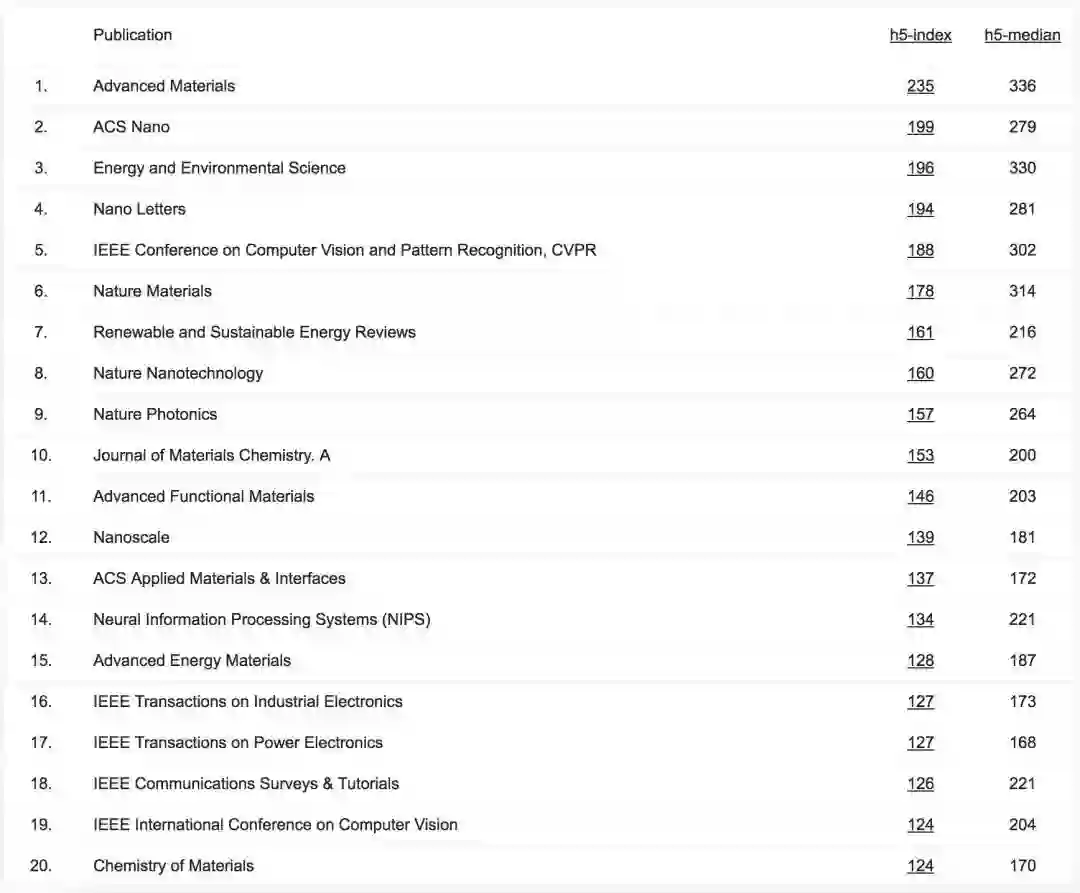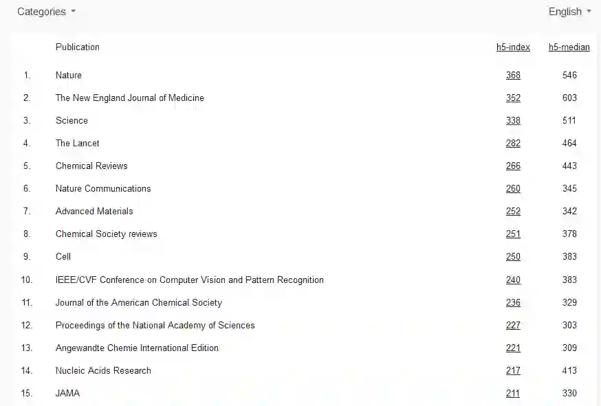 Google Scholar Top Publications 榜单从某种维度上反映了各大学术期刊和会议的影响力,以 h 指数(h-index)作为评判标准。h 指数是一个混合量化指标,可用于评估研究人员的学术产出数量与学术产出水平。
