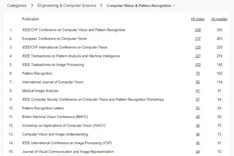 计算机视觉与模式识别的榜单毫无疑问由 CVPR 霸榜,ECCV、ICCV 分居二、三位。