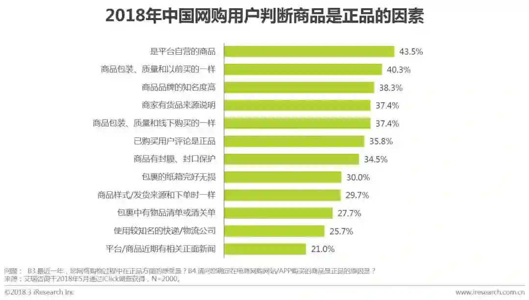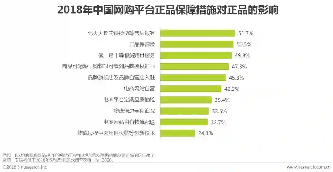 艾瑞调研数据显示,商品的售后赔付服务更能增加用户对平台所售卖商品是正品的信任度,其中七天无理由退换货等售后服务占比51.7%,假一赔十等假货赔付服务占比49.3%;商品是否有正品保障险也是影响用户对正品信任度的主要因素之一;随着消费升级,消费者网购早就由以前一味关注价格便宜、升级为注重商品品质。商品授权、正品保障险、售后保障服务是消费者选择网购平台的最主要因素。