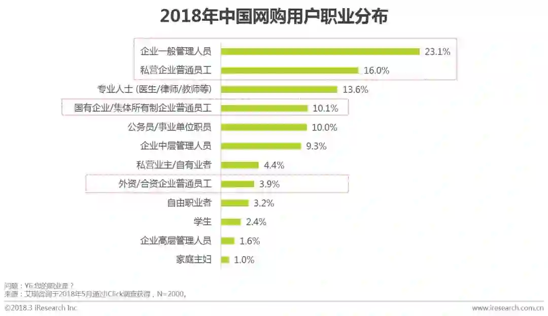 艾瑞调研数据显示,大部分网购用户学历较高,大学本科及以上学历占比76.7%,其中大学本科学历占比65.9%,为网购用户中主要消费人群,硕士及以上学历占比10.8%。在以职业划分的人群中,企业一般员工占比53.1%,企业中高层管理人员占比10.9%,专业人士占比13.6%,从职业划分角度来看,白领为主要消费人群。