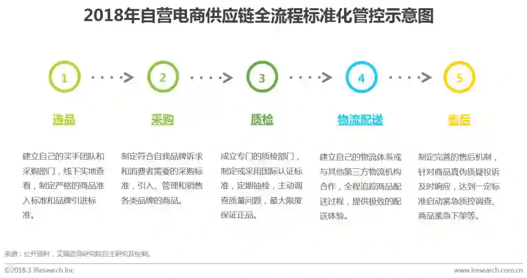 自营模式下,电商自己设置采购部门,自行选品、质检、采购、存储、销售、售后,从源头选品开始实现供应链的全程把控,是保证商品真实性的最有效方式。当电商供应链建立之后,应逐步加强自营供应链的标准化程度,实现对整个供应各环节的管控和梳理。