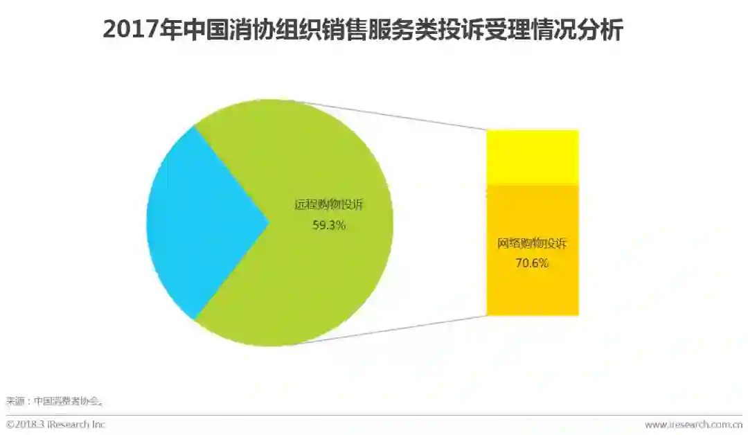 根据中国消费者协会最新数据,2017年全国消费者协会组织共受理销售服务类投诉69397件,其中远程购物为投诉最多的领域,占比达59.3%;而远程购物中以网络购物投诉为主,占远程购物投诉的70.6%。