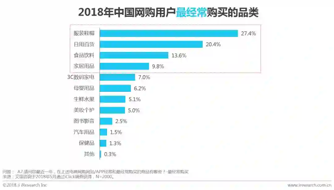 日用百货、服装鞋帽、家居用品及食品饮料为网购用户中经常购买的品类,其中服装鞋帽是最常购买的品类,占比为27.4%;其次为日用百货和食品饮料,占比分别为20.4%和13.6%。