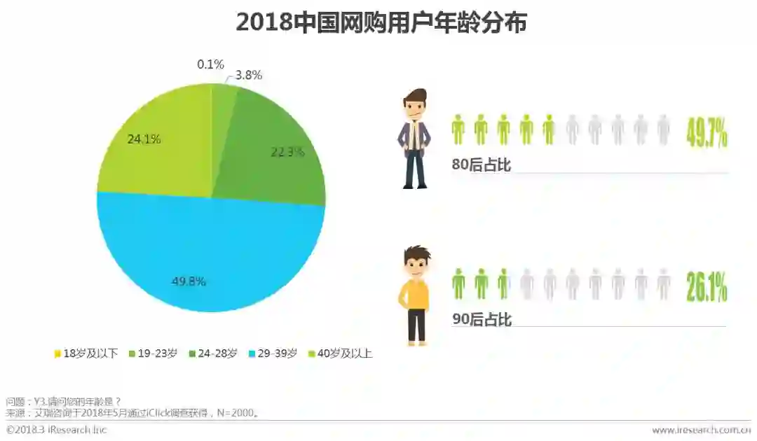 艾瑞调研数据显示,中国网购用户中80后占比最多,比例为49.7%,是网购消费主力人群;90后群体也不容小觑,占比26.1%,比例赶超70后。
