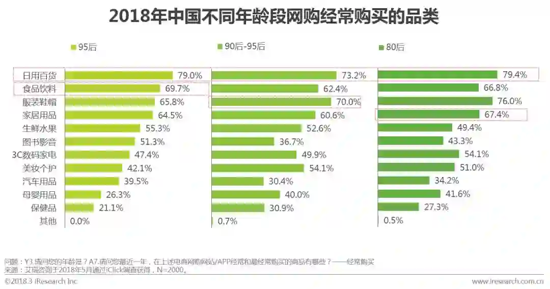 艾瑞调查数据显示,从不同年龄段经常网购的品类来看,所有年龄层次用户都爱买日用百货,相比较而言,95后具备“吃货”属性,更爱网购食品饮料;80后的消费品类则更家庭化,较爱购买家具日用类商品;90后-95后年龄段的用户更“爱美”,经常购买服装鞋帽和美妆个护。