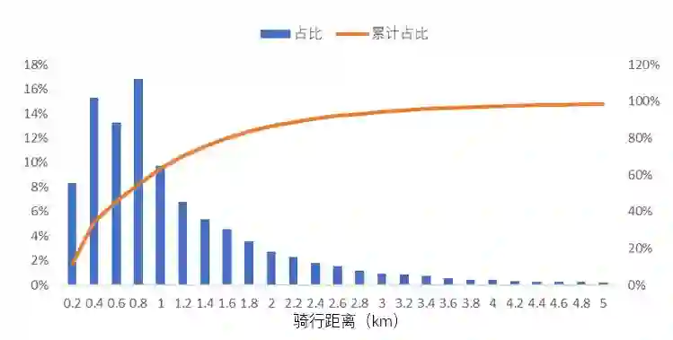 对某个共享单车品牌一天中移动超过100m的单车数据进行分析,骑行总量为4.3万次,车辆日均骑行次数为3.9次/辆。骑行距离方面,平均单次骑行距离约1.1公里,约82%的骑行出行距离在1.6公里以内,其中1公里以内的出行占比约63.4%。这也充分反映了共享单车对城市交通的“最后一公里”发挥着重要作用。从骑行时耗来看,平均单次骑行时间约9.8分钟,其中4分钟至6分钟占比最高,约24%。
