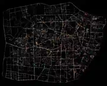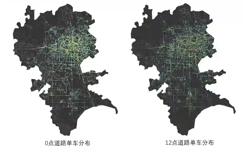 从单车在城市道路的分布情况来看,不论夜间还是工作时间,在二环内,共享单车在主干路、次干路甚至支路上均有较多分布,二环外则主要沿城市干道沿线分布,支小路分布相对较少。