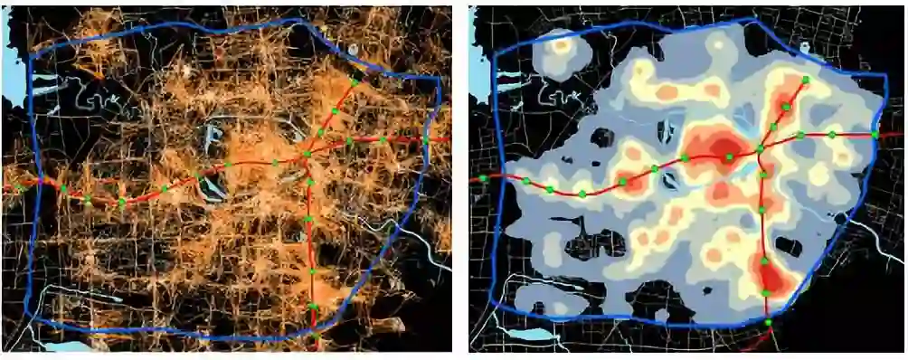 从骑行轨迹分布来看,轨道交通站点周边依然是骑行的主要分布区。在核心区的轨道站点周边,出行需求来自轨道交通站点周边的各个角落,并呈放射性发散,站点周边不论主干路还是支小路都有大量的骑行需求。而在城市外围地铁站周边,骑行主要分布在非机动车通行条件较好的干路上。