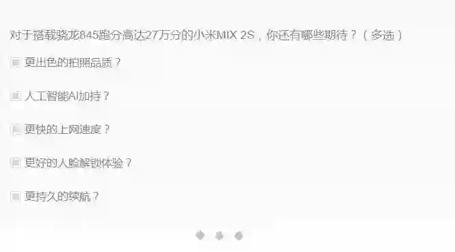 在小米公号预热文文末,附有投票表格——对于搭载骁龙845跑分高达27万分的小米MIX 2S,你还有哪些期待?选项包括更出色的拍照品质、人工智能AI加持、更快的上网速度、更好的人脸解锁体验、更持久的续航。雷锋网据此猜测,小米MIX 2S或将在摄像、AI、内存、人脸解锁、以及电池等方面发力,但是否会加入屏下指纹识别,尚未可知。