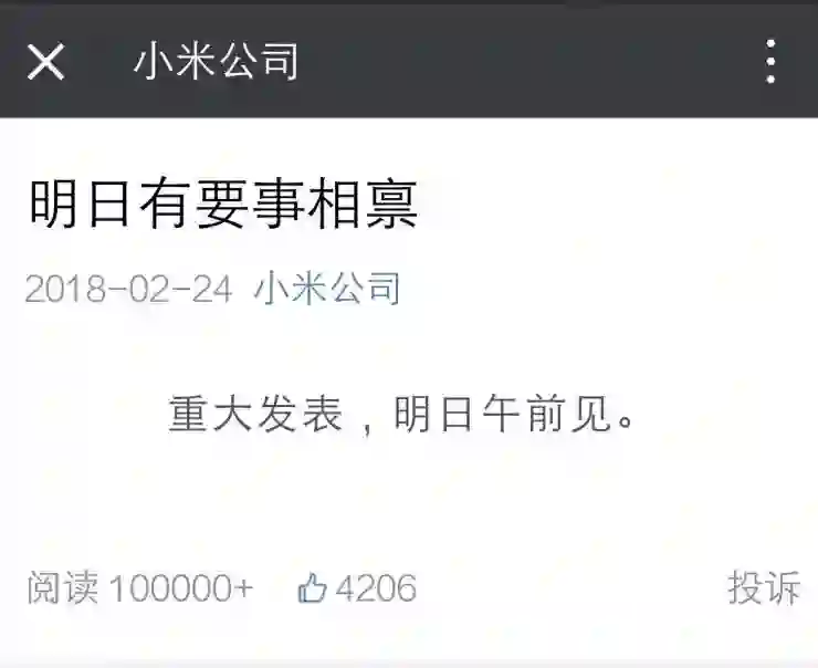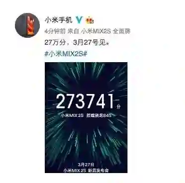 2月24日,小米公司公号发布题为《明日有要事相禀》的文章称,“重大发表,明日午前见”;2月25日11点,小米新浪微博与微信公众号相继发布揭秘文章——《小米MIX 2S 搭载骁龙845,3月27日见!》预热了一波3月27日的新品发布会。一番悬念挑逗下来,只能说,小米营销套路深。
