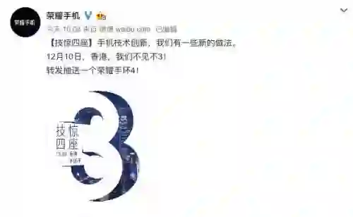 昨日据外媒报道,荣耀官方已经向海外媒体发出邀请函,宣布将于明年1月22日在巴黎举办发布会,此前传闻的荣耀V20新机将有望亮相。现在有最新消息,荣耀官方在国内同样放出了一张预热海报,宣布将在12月10日在香港召开发布会。