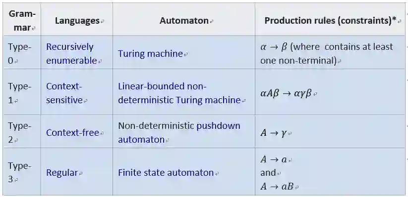 这里先回顾一下形式语言与自动机理论,下图和表格分别为乔姆斯基文法体系以及自动机与文法间的对照关系: