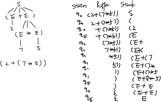从形式语言的角度来说,上下文无关文法(CFG)以及其对应的PDA可以建模程序语言,能够处理递归文法结构,下图简单的以计算表达式的解析(parsing)来举例: