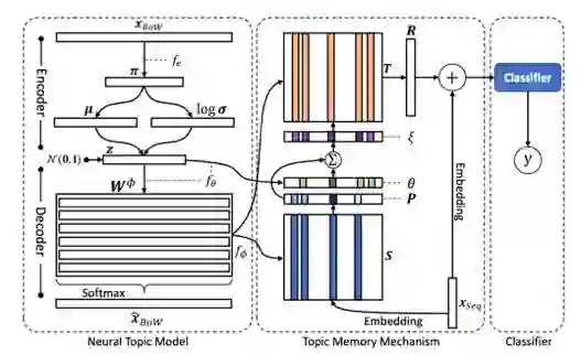 神经主题模型则是基于这一观察,在一般的分类模型处理的同时使用主题模型对训练集中的样本抽取主题保存在存储模块中(作为长期记忆)辅助分类。这里的主题模型使用了变分自编码器进行实现,与分类模型得到的损失函数差值联合优化,模型结构图如下所示,本文不详细展开说明。