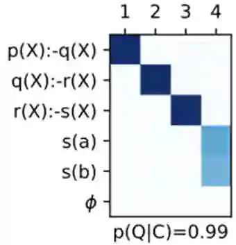 该模型在这个任务上学习到的策略为上文提及的backward chaining,将每一个推理时刻模型关注到不同句子的强度可视化,可以得到下图: