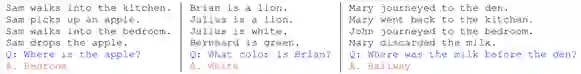 该任务是给定一些已知事实(若干个句子,往往时序相关),给一个问题,在词表中选出一个单词作为答案。如下表所示: