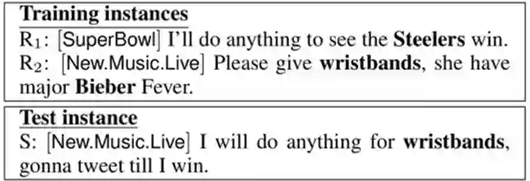 可以看到测试样例包含的与分类较相关的词为“wristbands”,而单从这一句话来看由于重要词汇的稀疏性,如果没有相关的外部知识,很难判断出这个句子应属于音乐相关的类别,而对于统计机器学习模型来说,
