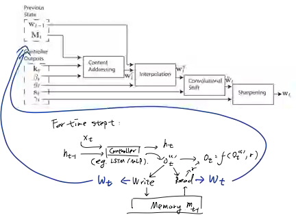 该框架由控制器、存储模块和读写机制构成。控制器一般用LSTM/MLP(多层前馈神经网络)实现,对于t时刻,类似于一般的RNN结构,控制器读入上一时刻的(控制器)状态,以及当前输入